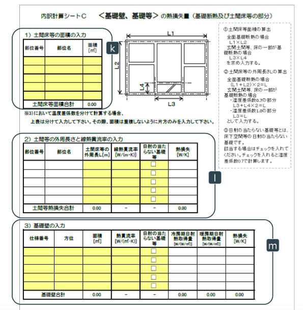 「土間床等の面積」「土間床等の外周⻑さと線熱貫流率」「基礎壁」の入力により、土間床等の面積と土間床等の外 周部、基礎壁による熱損失を計算するシートです。