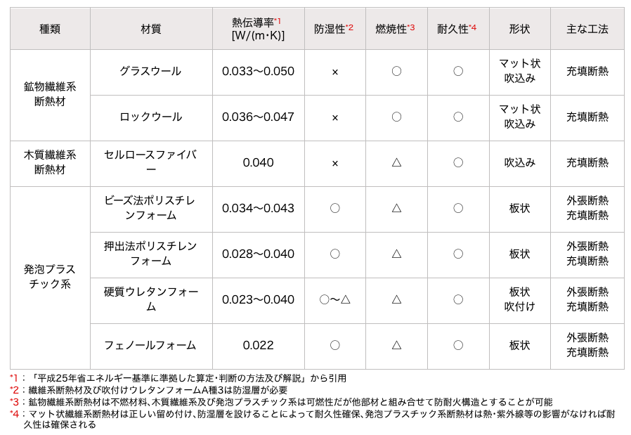 断熱材の性能を表す「熱伝導率(λ)」は、数値が小さいほど断熱性能が高いことを表しますが、熱伝導率の数値のみ比較し「発泡プラスチック系のほうがグラスウール断熱材より優れている」と判断するのは大きな誤解です。