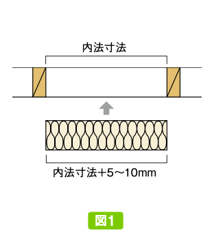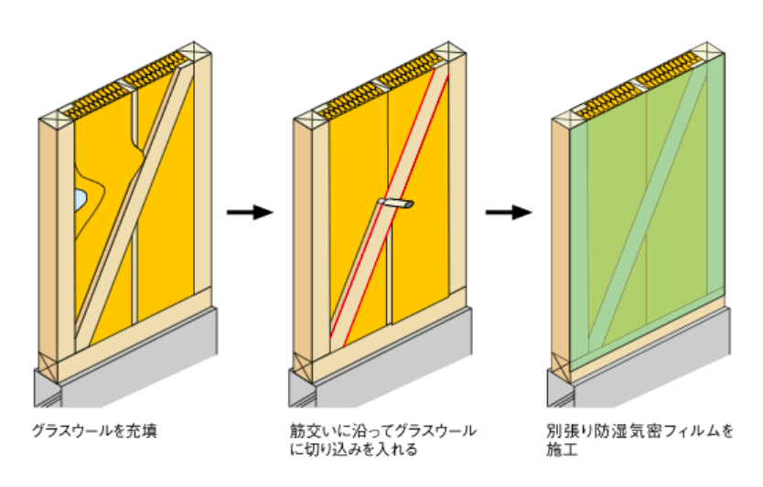 充填断熱工法は、柱などの構造材の間に断熱材を入れる方法です。