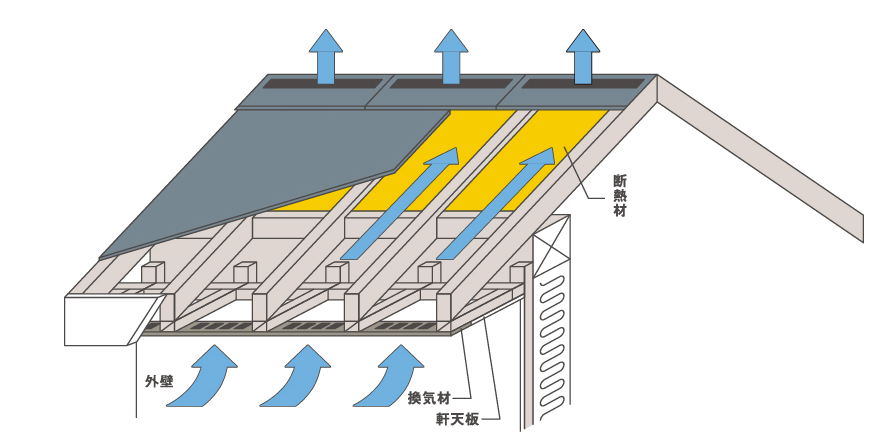 屋根部分に熱が溜まりにくくするために空気が流れる層を作る事です。