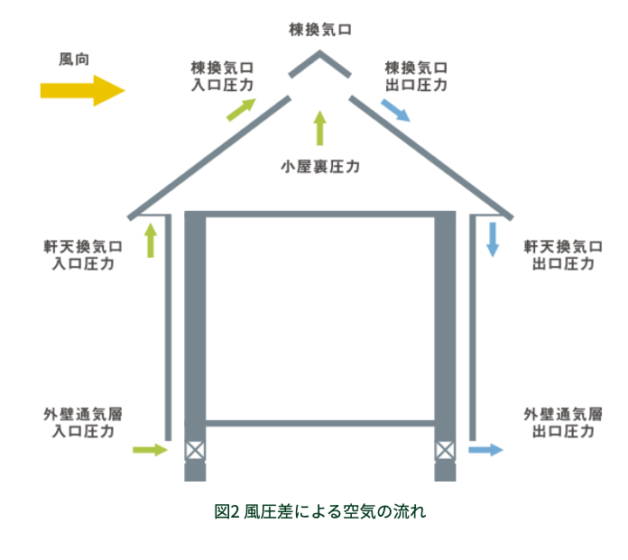 小屋裏に空気を送る仕組みは、風圧力の利用と小屋裏内の温度と外気の温度差の利用です。